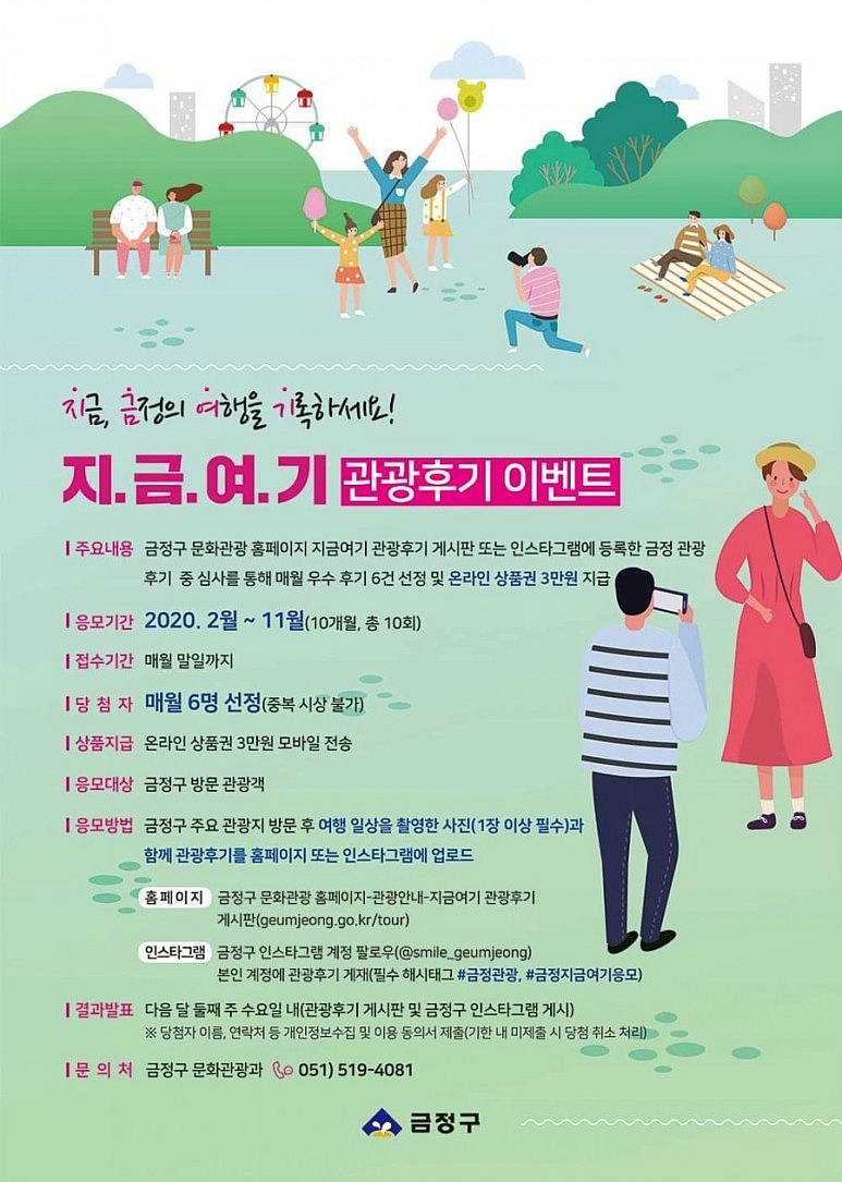 지금 금정의 여행을 기록하세요! 금정 지.금.여.기 관광후기 이벤트 개최 ❍ 응모기간 : 2020. 2. ~ 11.(10개월간, 총 10회 실시) ❍ 접수기간 : 매월 말일 ❍ 응모대상 : 금정구 방문 관광객 ❍ 응모분야 : 금정구 관광 후기(글, 사진) ❍ 응모방법 : 주요 관광지 방문 후 여행일상을 촬영한 사진(1장 이상 필수)과 함께 관광후기 업로드 ❍ 응모매체 ▷ 홈페이지 : 문화관광 홈페이지 – 관광안내 – 지금여기 관광후기 게시판 ▷ SNS 계