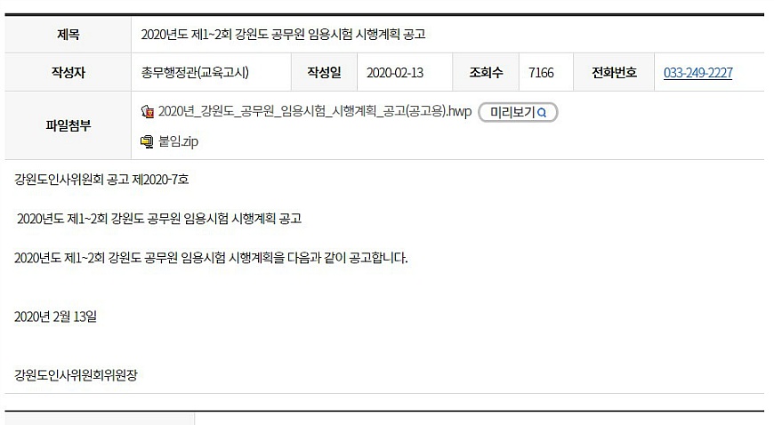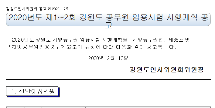 강원도인사위원회 공고 제2020-7호 2020년도 제1~2회 강원도 공무원 임용시험 시행계획 공고 2020년도 제1~2회 강원도 공무원 임용시험 시행계획을 다음과 같이 공고합니다. 2020년 2월 13일 강원도인사위원회위원장