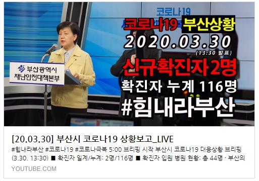 | 부산 유튜브 붓싼뉴스 20. 03. 16(월) 부산시 코로나19 상황보고 부산시청 기자회견장 (1) | 2020.03.16 |