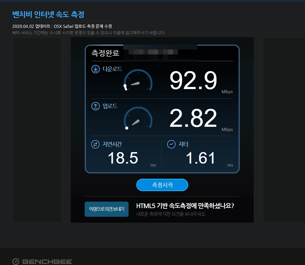 벤치비 인터넷 속도측정 결과