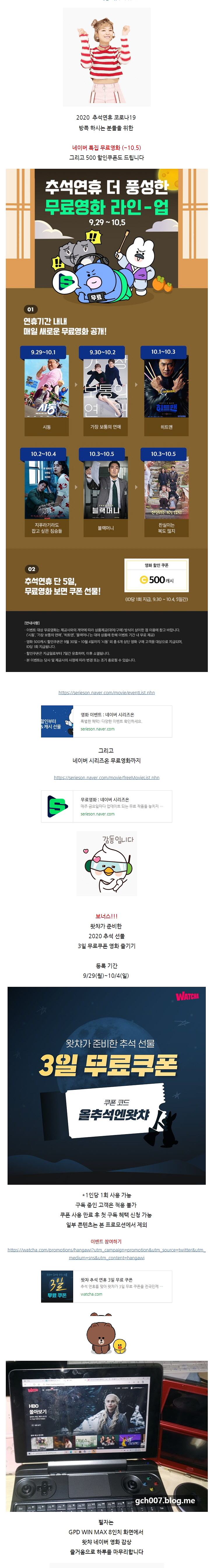 2020년도 추석연휴 네이버 특집 무료영화 왓챠3일무료쿠폰 이벤트 GPDWINMAX 윈맥스 영상플레이 윈��