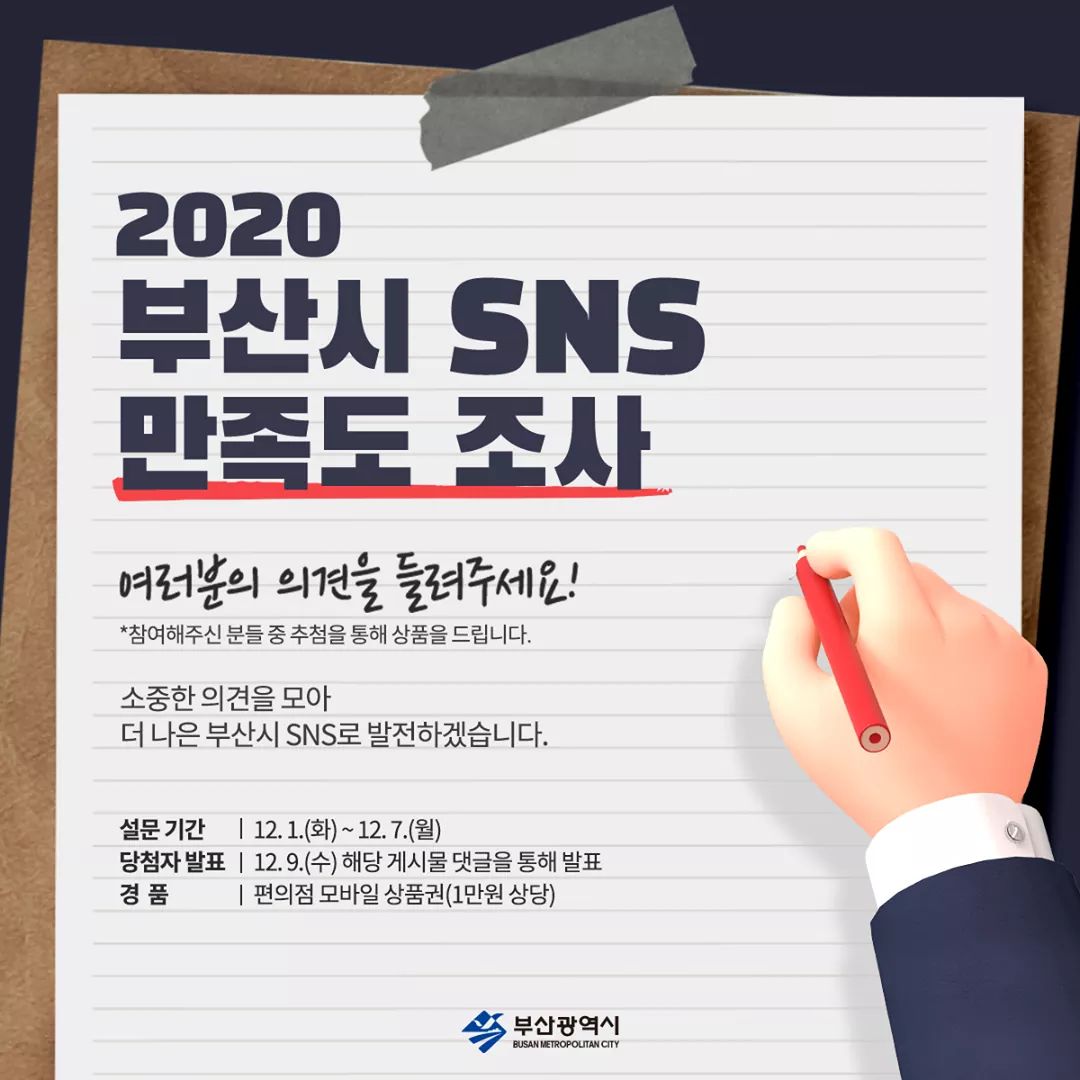 안녕하세요. 2020 부산시 SNS 이용자 만족도 조사에 참여해주셔서 진심으로 감사드립니다. 「2020년 부산시 SNS 이용자 만족도 조사」를 통해 이용자 여러분의 소중한 의견을 수렴하고자 합니다. 이